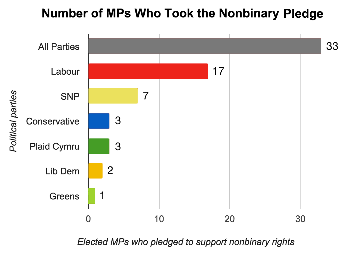 Chart showing numbers of now elected MPs who took the Nonbinary Election Campaign pledge during the election campaign, separated by their party affiliation: