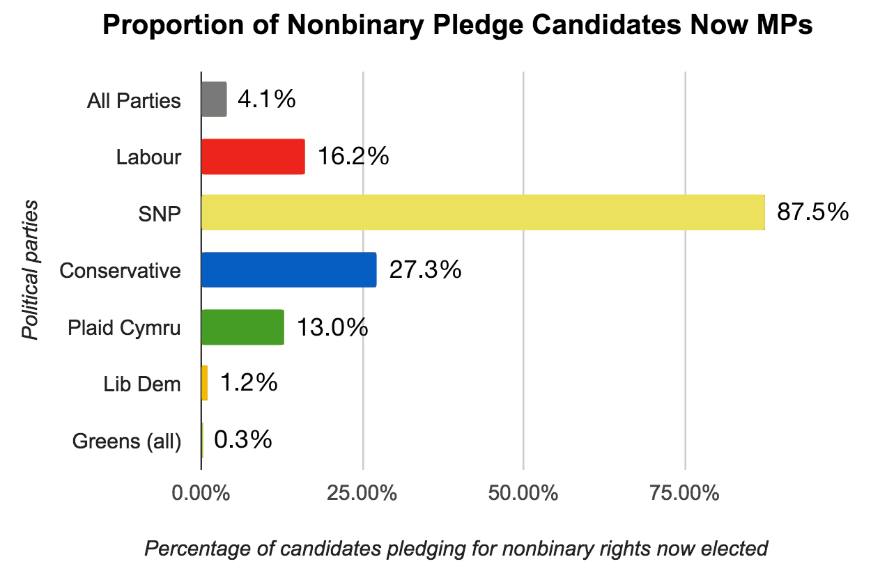 Chart showing the proportion of candidates who pledged to support the Nonbinary Election Campaign who are now actually elected members of parliament, separated by their party affiliation: